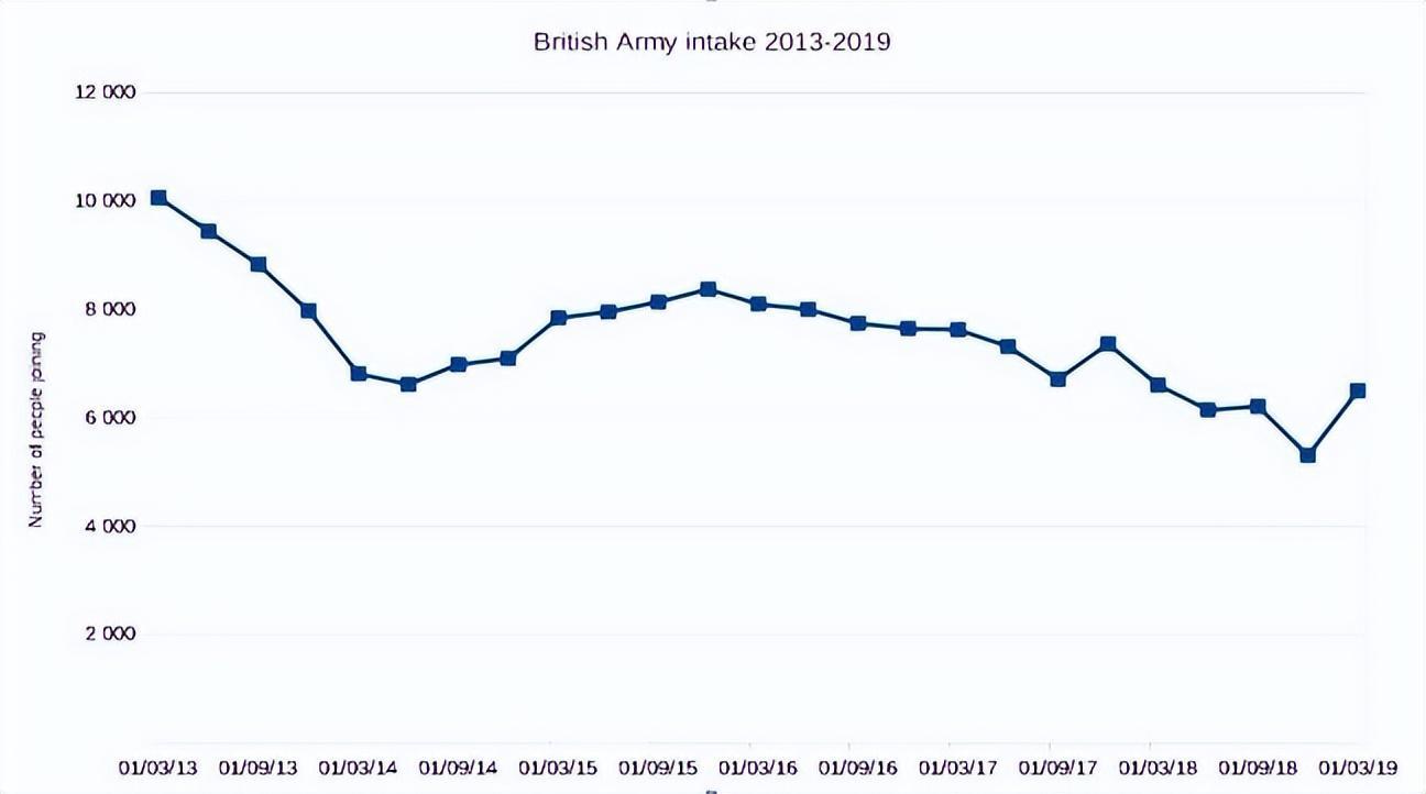 2013-2019年,加入英國陸軍的新兵數量呈下降趨勢,圖源外媒The Register