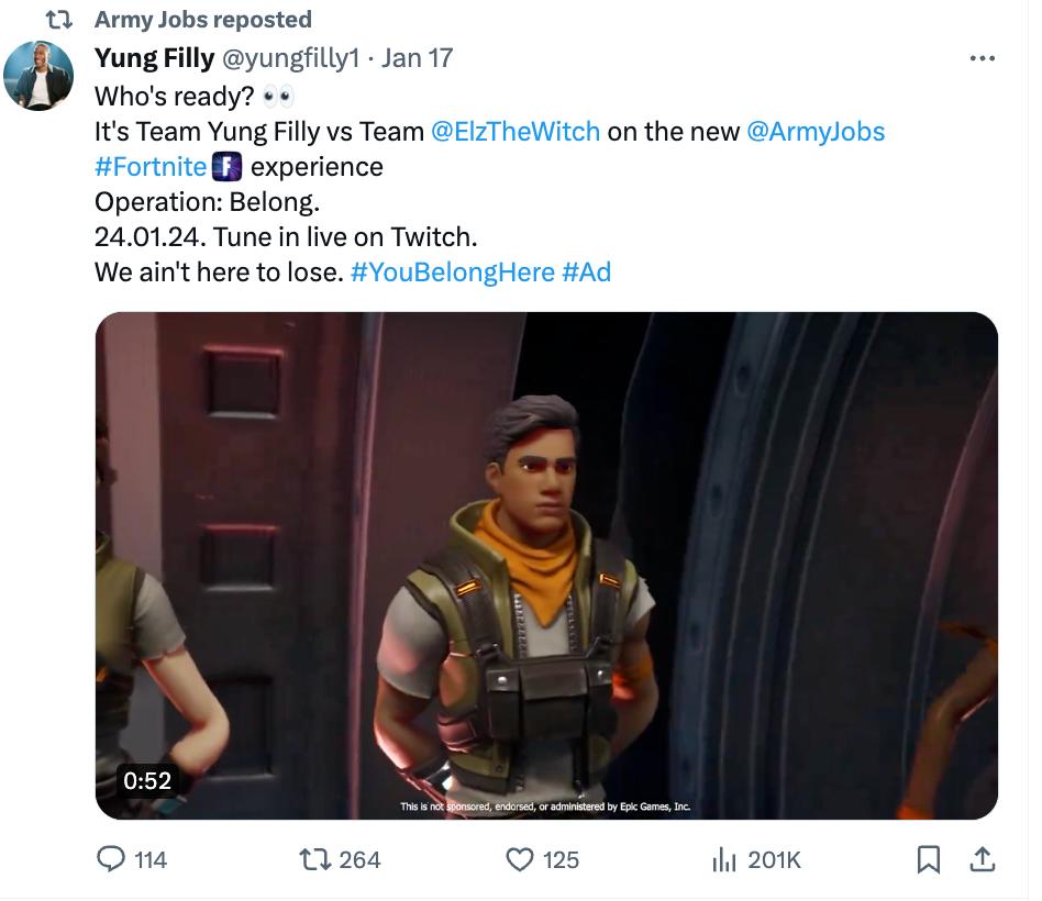 按照計劃,英國陸軍將在1月24日舉辦一場比賽,由兩位英國視頻博主Yung Filly和Elz the Witch分別帶領兩支團隊,在這張“行動:歸屬”地圖上進行對戰。兩位博主也爲官方背書,轉發推文幫忙宣傳。