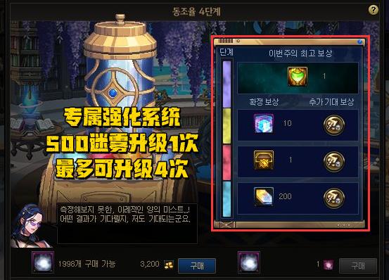 玩家可通過消耗“迷霧”對該系統升級,每次升級需要消耗500個迷霧,最多可升級4次,升級越高、通關可獲得的額外獎勵就越多!(也可以不升級,就沒有額外獎勵)