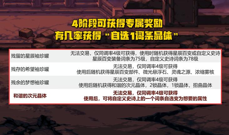 從3階段開始,次元晶體就比較有吸引力了;而最核心的當然還是4階段,從這裏開始就有概率出現小百變零件、鎖1/2詞條的晶體、以及最厲害的“自選晶體”!