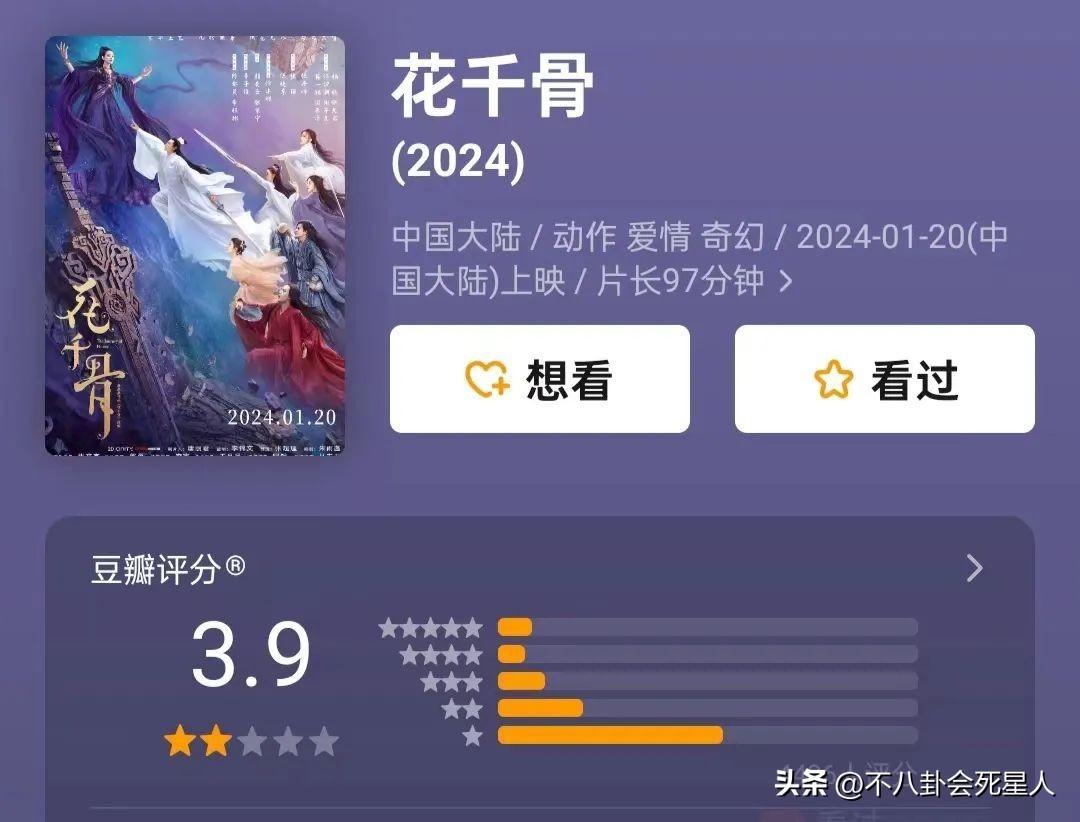 這樣的評價是中肯的、客觀的、實事求是的,《花千骨》上映後遭到全網吐槽,上映6天,票房僅有541.5萬,評分只有3.9分,口碑票房都崩塌,可以說是“血撲”。