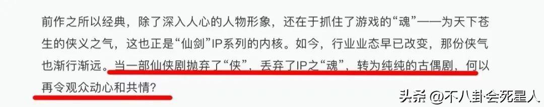 不得不說,這樣的評價真是一針見血,一語中的。雖然《祈今朝》改過名字,但其故事內容是《仙劍六》,它和《仙劍四》播出時間將近,加上又都是仙俠題材,難免被放在一起被議論。