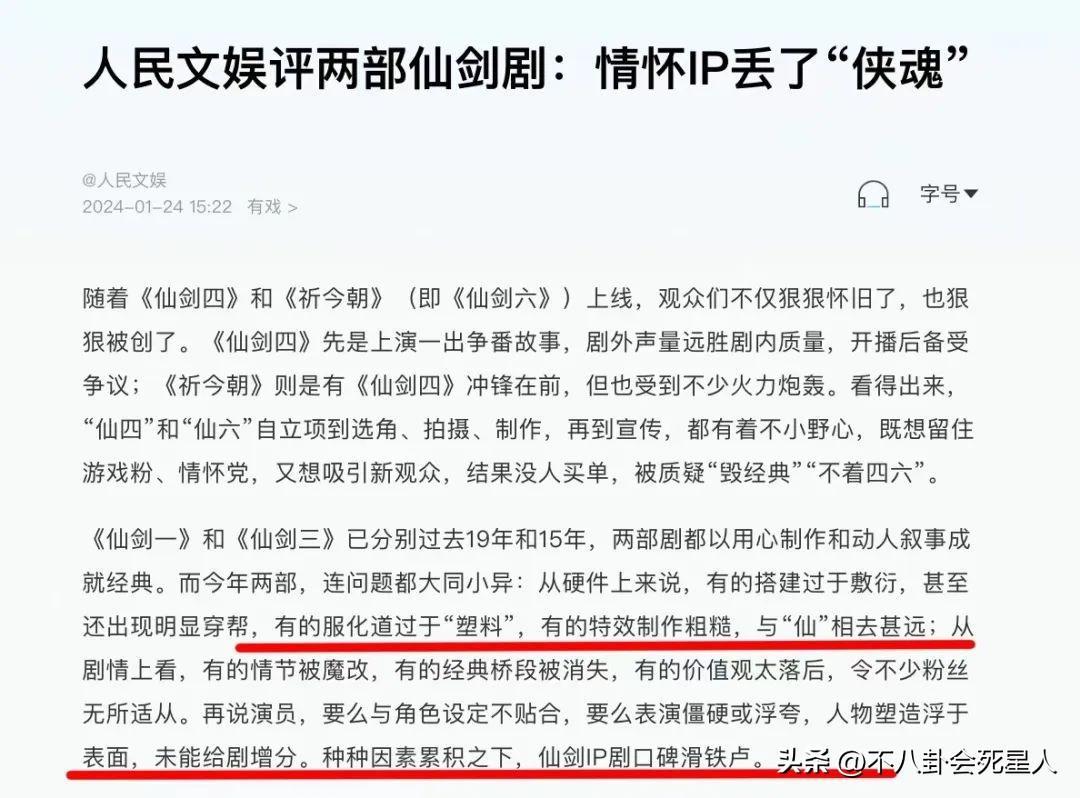近日,人民文娛發聲,對熱播劇《仙劍四》和《祈今朝》做出點評,稱是情懷IP丟了“俠”和“魂”。