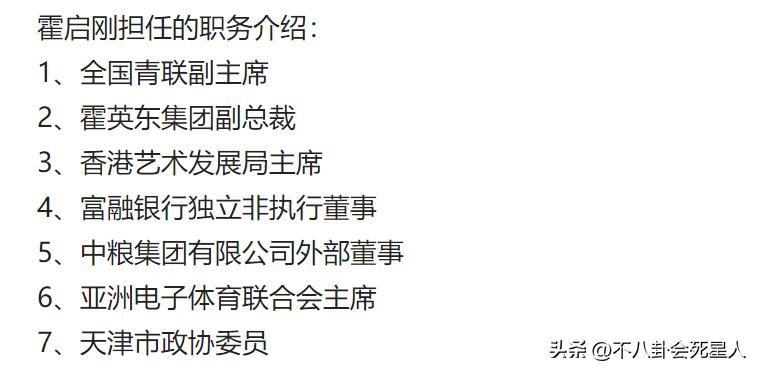 有網友粗略統計,今年才44歲的霍啓剛,不但擔任自家霍英東集團的副總裁,香港藝術發展局主席,還在內地擔任了多個職務,比如全國青聯副主席,中糧集團外部董事,天津市政協委員,多達7個職務。
