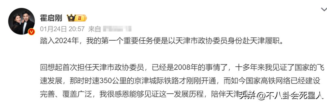 近日,霍啓剛髮長文宣佈,自己在2024年第一個最重要的任務就是以天津市政協委員的身份去天津履職。