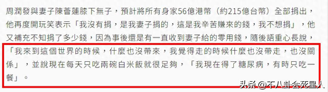 但其實周潤發晚年之所以這麼消瘦,可能跟他晚年患有糖尿病有關係。他之前就透露過,因爲患糖尿病,每天只喫兩碗飯就夠了,有時候每天只喫一頓。
