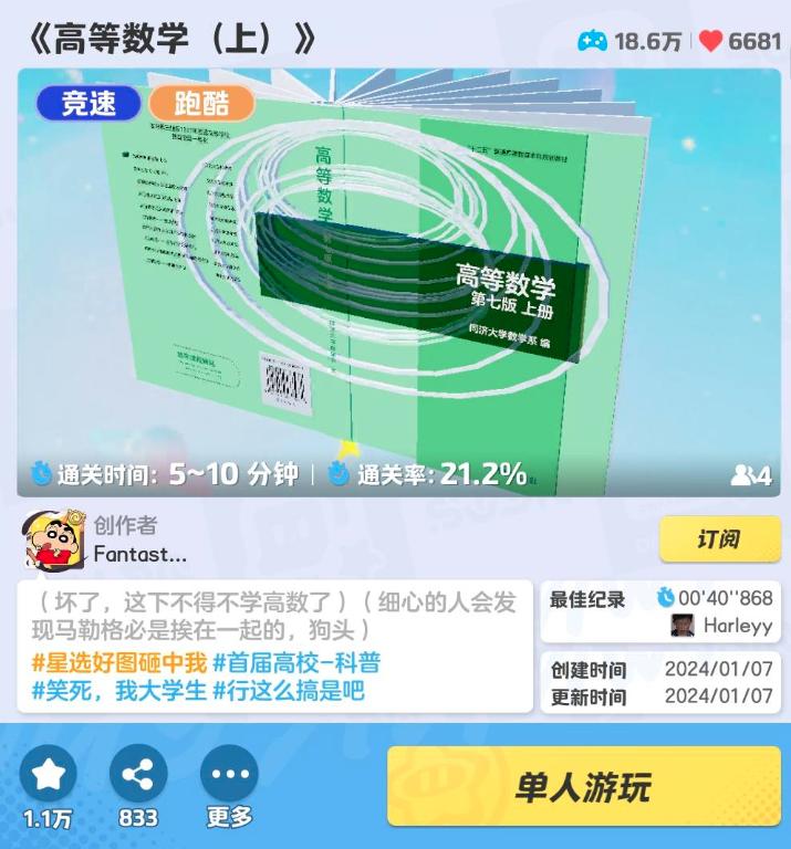 這也讓遊戲的UGC地圖出現了大量跳脫出常規玩法之外的“娛樂形式”,就比如玩家還可以在其中找到以純觀賞爲主的國風、文創類地圖;以“高等數學”“英語四級”爲靈感的益智類地圖,而根據主創團隊在信中的說法,超過10%的遊玩量便來自於這些用戶自創的“燒腦”地圖。
