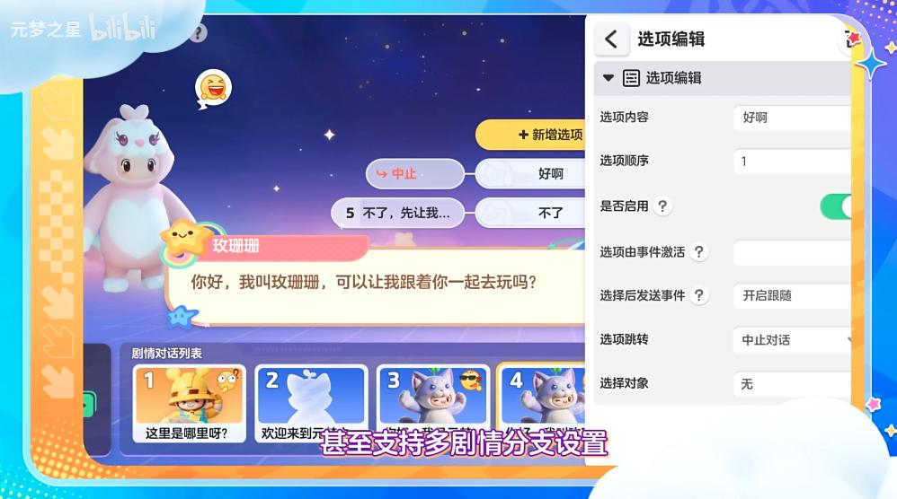 在到來的新版本中,“星世界”的功能相比之前做了大幅的升級。除了原有資源庫的種類增加外,這次還新增了“劇情編輯器”功能,可以自定義人物的表情、動作以及對話內容,甚至還支持多劇情分支設置。