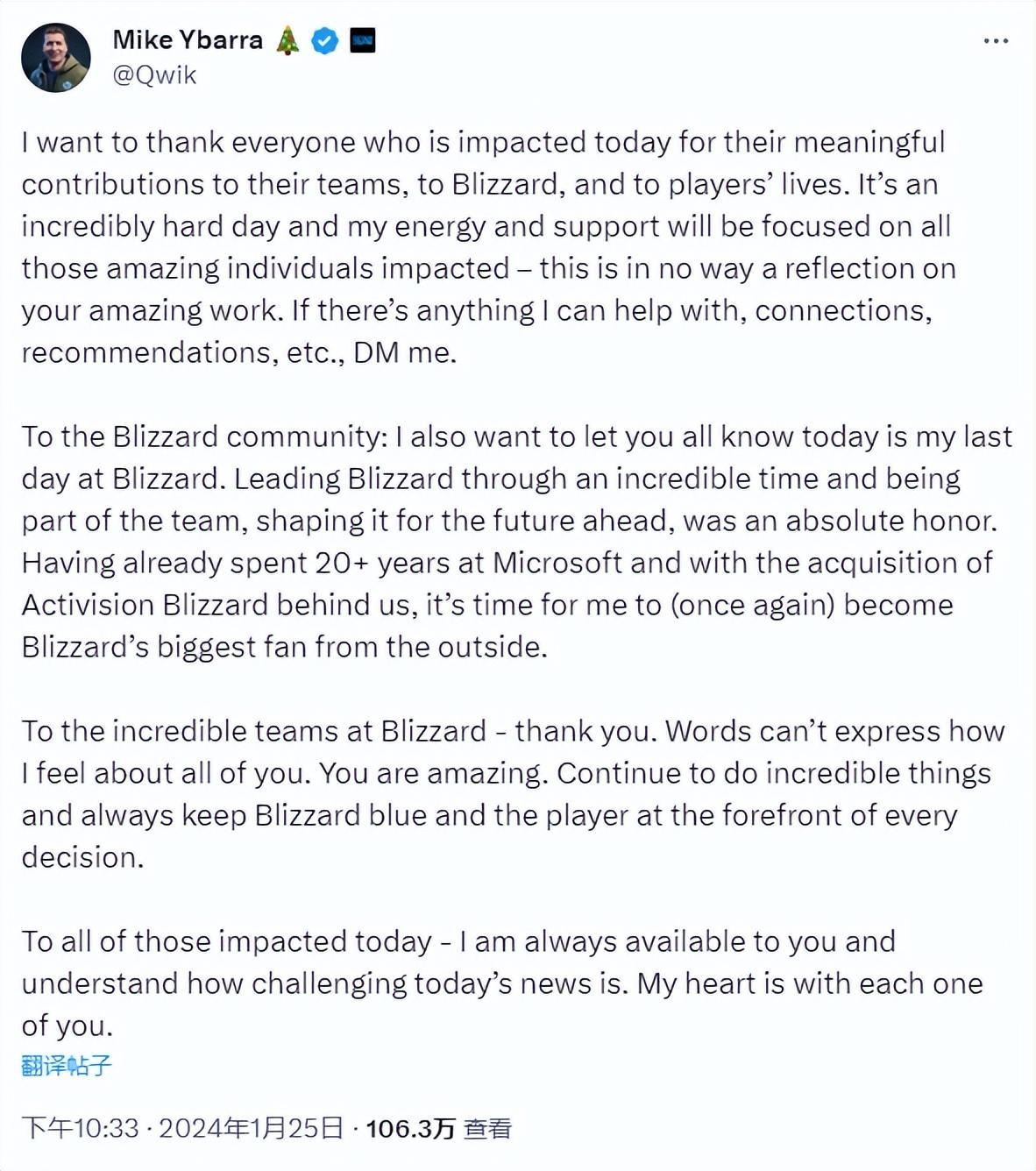 其中,剛被收購的動視暴雪調整幅度較大。暴雪總裁Mike Ybarra、暴雪首席設計師Allen Adham等多位成員都將確認離開。前者曾任職Xbox高管,於2019年加入暴雪。後者則是暴雪最早的聯合創始人之一。