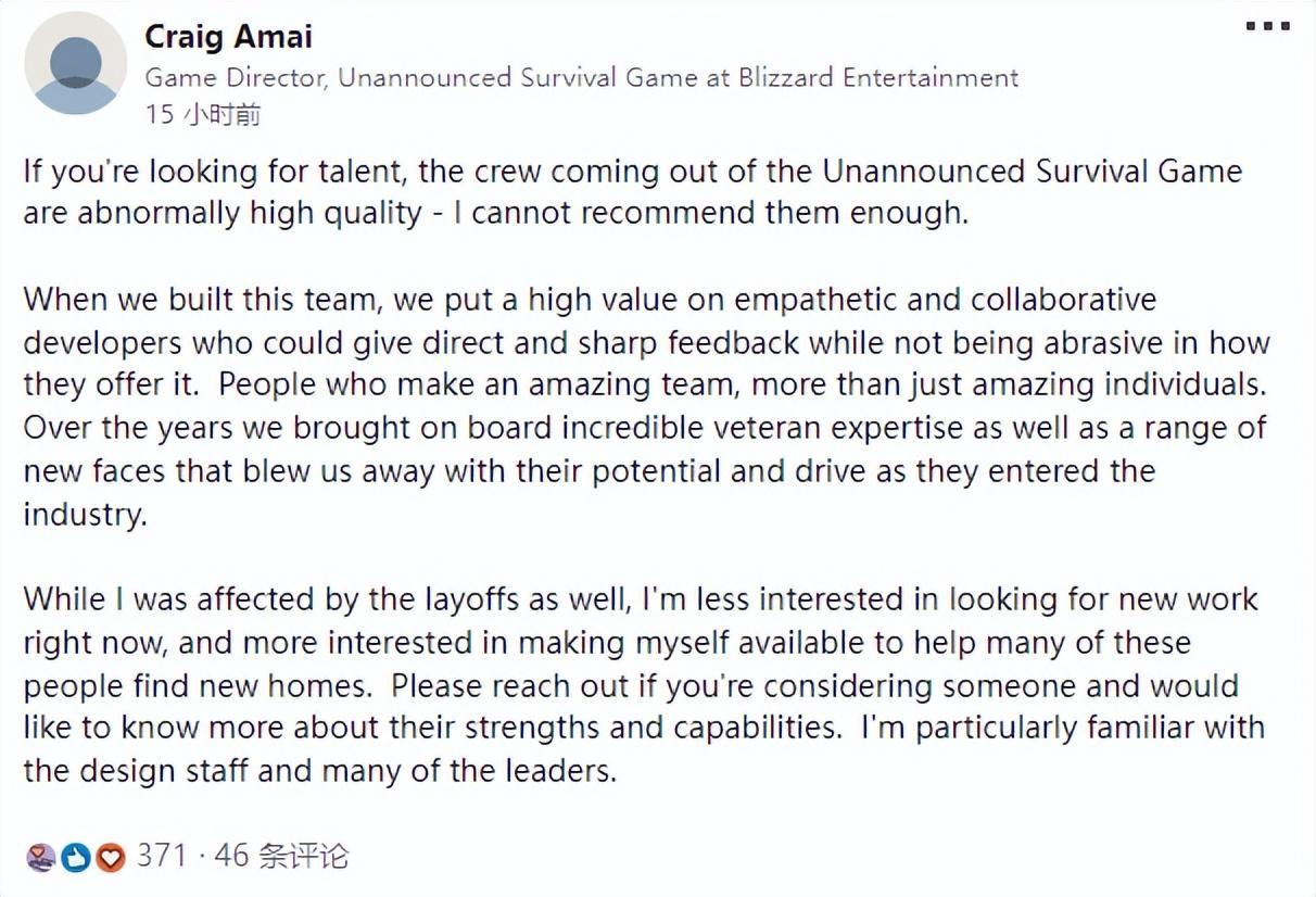 目前,團隊的許多離職成員都在X上求介紹。前總監Craig Amai更是直接在領英上寫下推薦帖,希望能幫大家找到新工作。