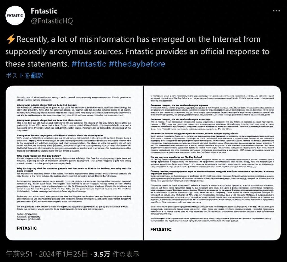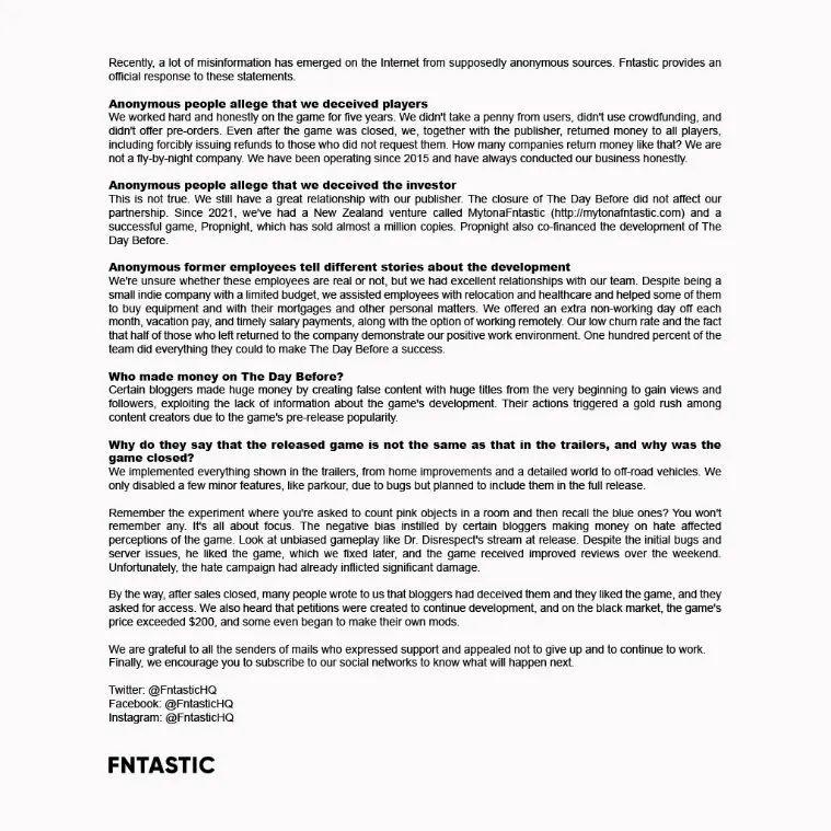 公告先是澄清了Fntastic欺騙玩家和投資人的說法,表示工作室自從2015年開始運營以來,全身心地投入到遊戲開發,從未以衆籌、預購的理由向玩家收過錢,遊戲停服後還進行了退款。同時,工作室現在仍然和發行商Mytona保持着良好的關係,《浩劫前夕》的失敗並沒有讓他們的關係破裂。