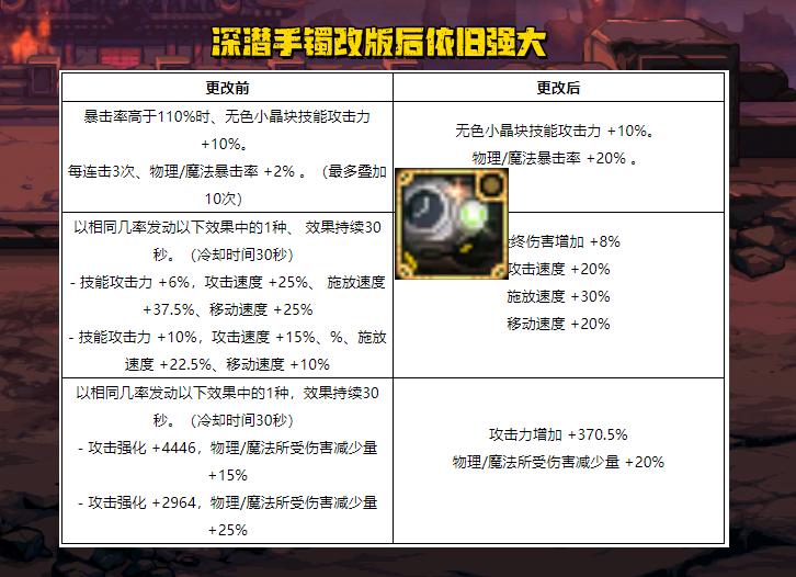 【1】深潛手鐲,國服唯一個指名點姓優化的裝備,3個詞條都得到了優化,隨機詞條6技攻/10技攻,改版後變成了8技攻,上限降低、下限提高。