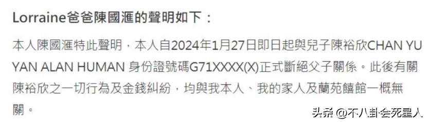 沒想到這還是一個無底洞,以致於陳父不得已與其斷絕關係,特地發了聲明並貼在了陳家餐廳的門外,很明顯是不想再管兒子的債務問題,也是直接公開地告訴其債主,不用上門來找陳家人了。