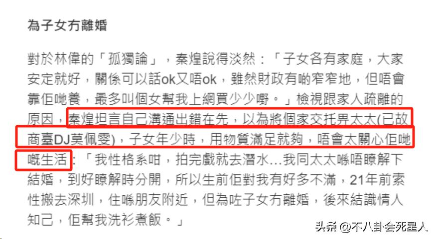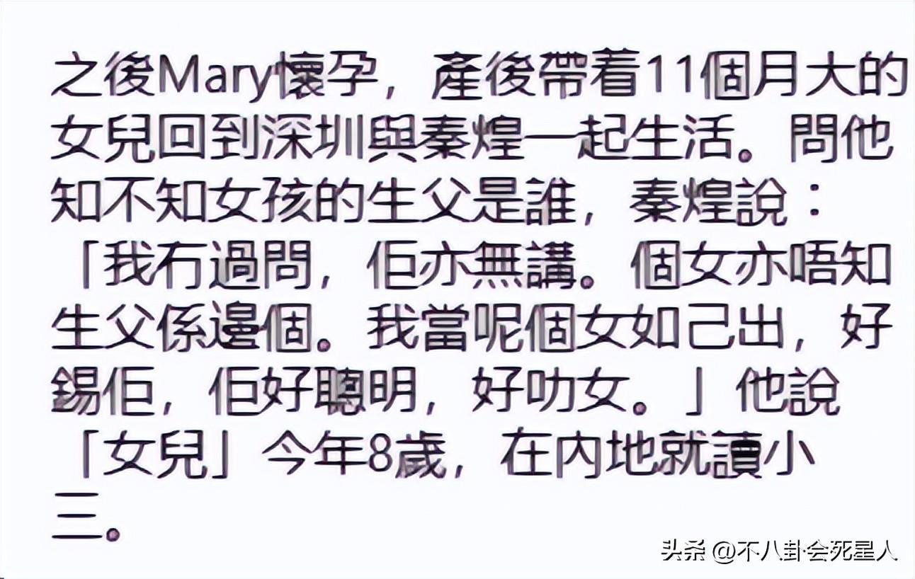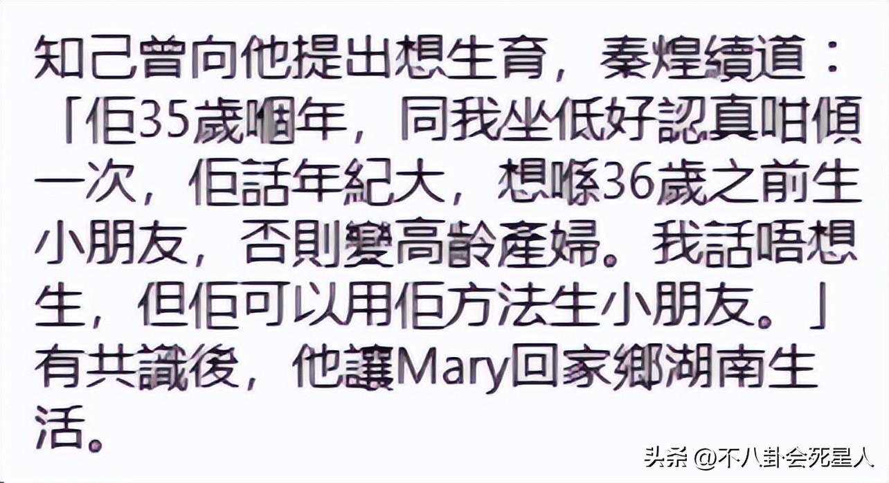 秦煌在原配妻子去世後,也沒有想過再和情人結婚生子,情人Mary在自己35歲時向秦煌提出過自己想要生小孩的想法,害怕再拖久了自己年齡不適合了。