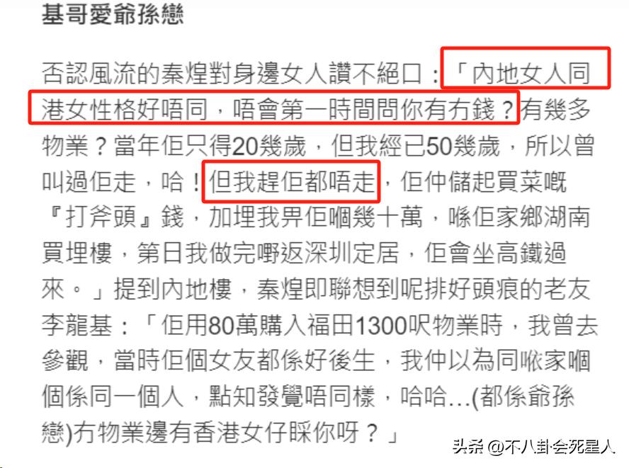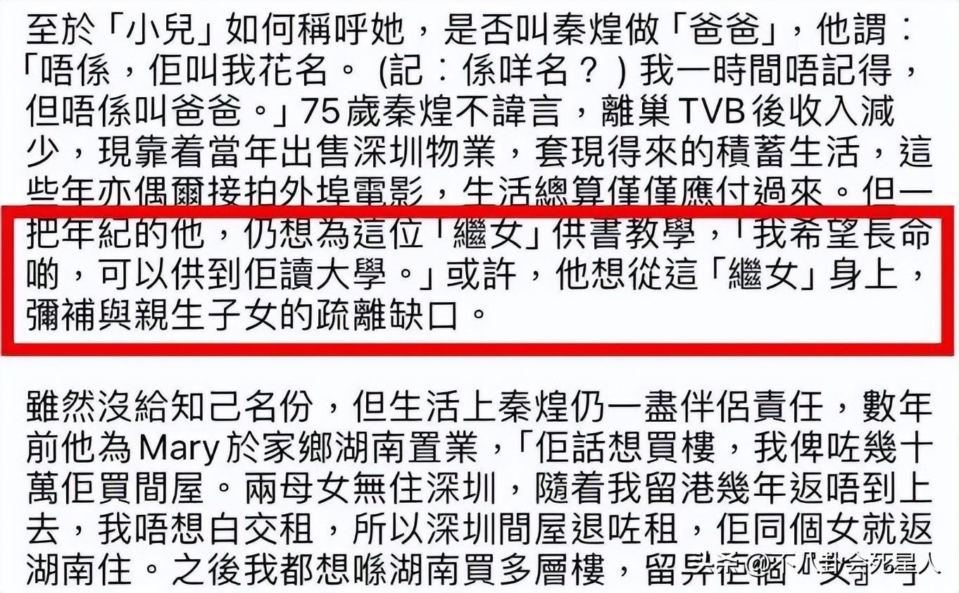 如今秦煌年齡大了,越發渴求親情,直言會將繼女養到大學畢業,甚至還要爲她買套房子,秦煌還表示自己的四個孩子都不知道繼女的存在。