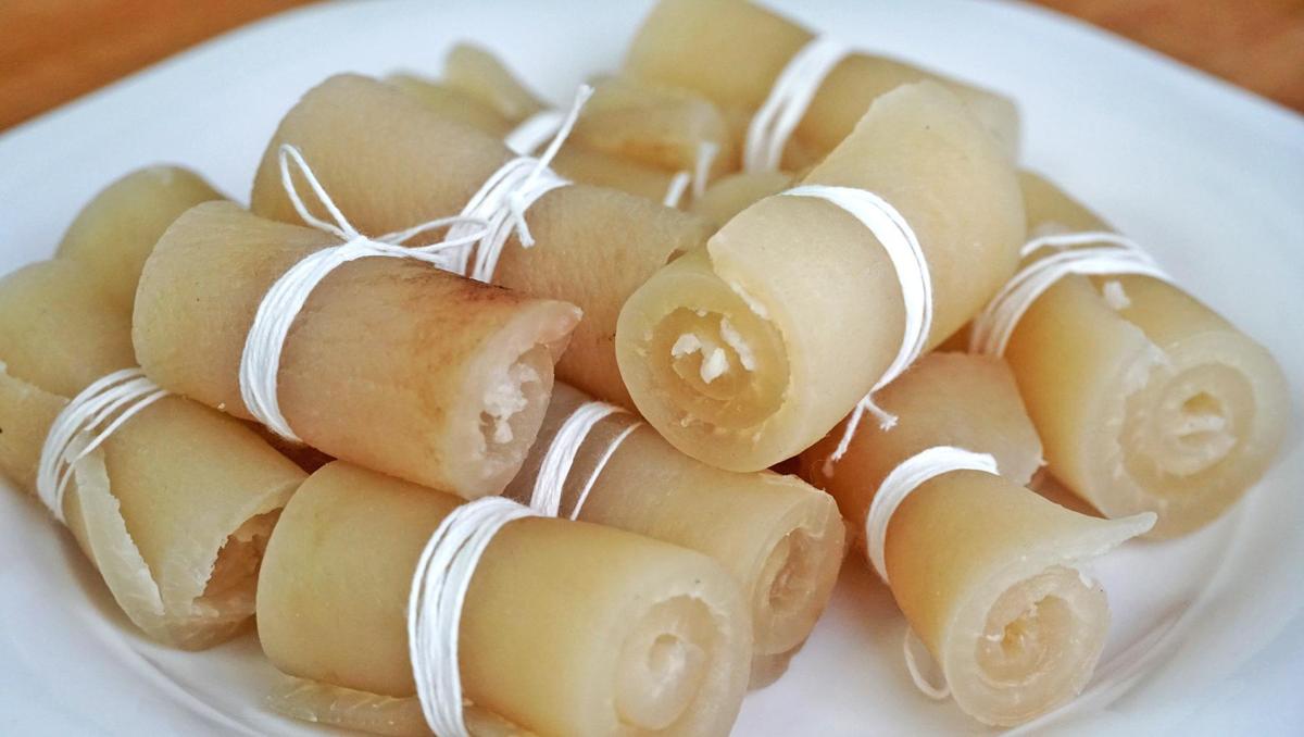 4、找出一些乾淨的棉線,先把豬皮捲起來,再用線繫緊。一個肉皮卷就做好了,每一個都要像這樣做好。
