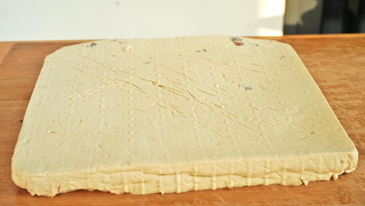 9、表面用紗布再蓋起來,接着用板子壓一下後放上一盆清水,這一步就是製作豆腐了,把豆腐腦裏面的水分壓出來後就是豆腐了。