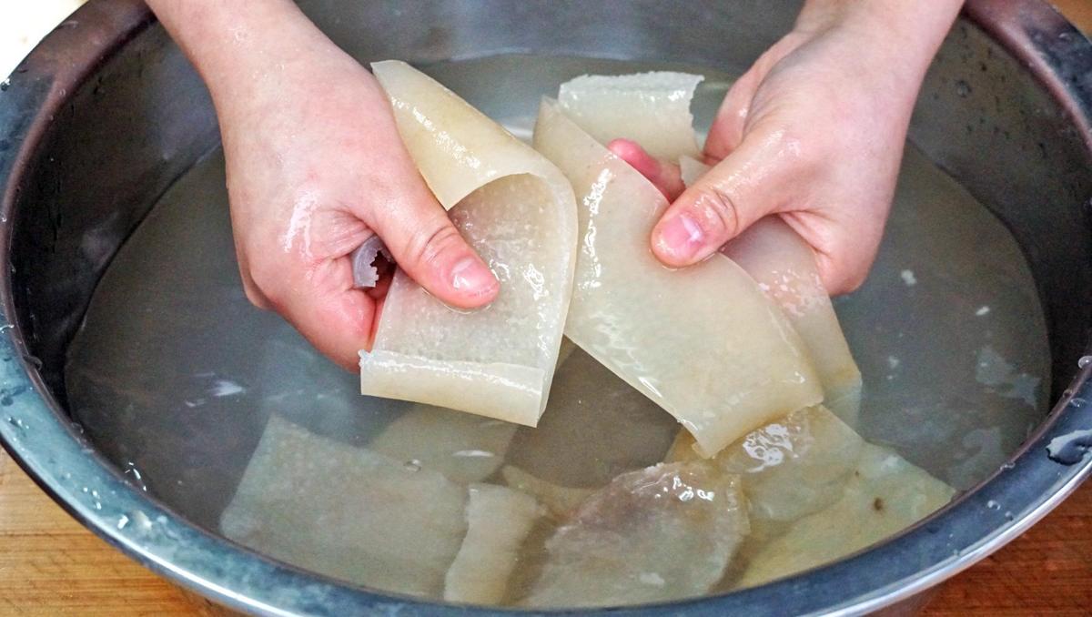 2、煮開後撇去浮沫,繼續煮五分鐘接着撈出來,用刀把豬皮裏面多餘的油脂都刮下來刮成這種透亮透亮的就可以了,再改個刀切小點。