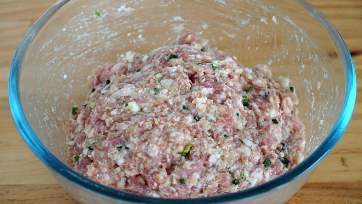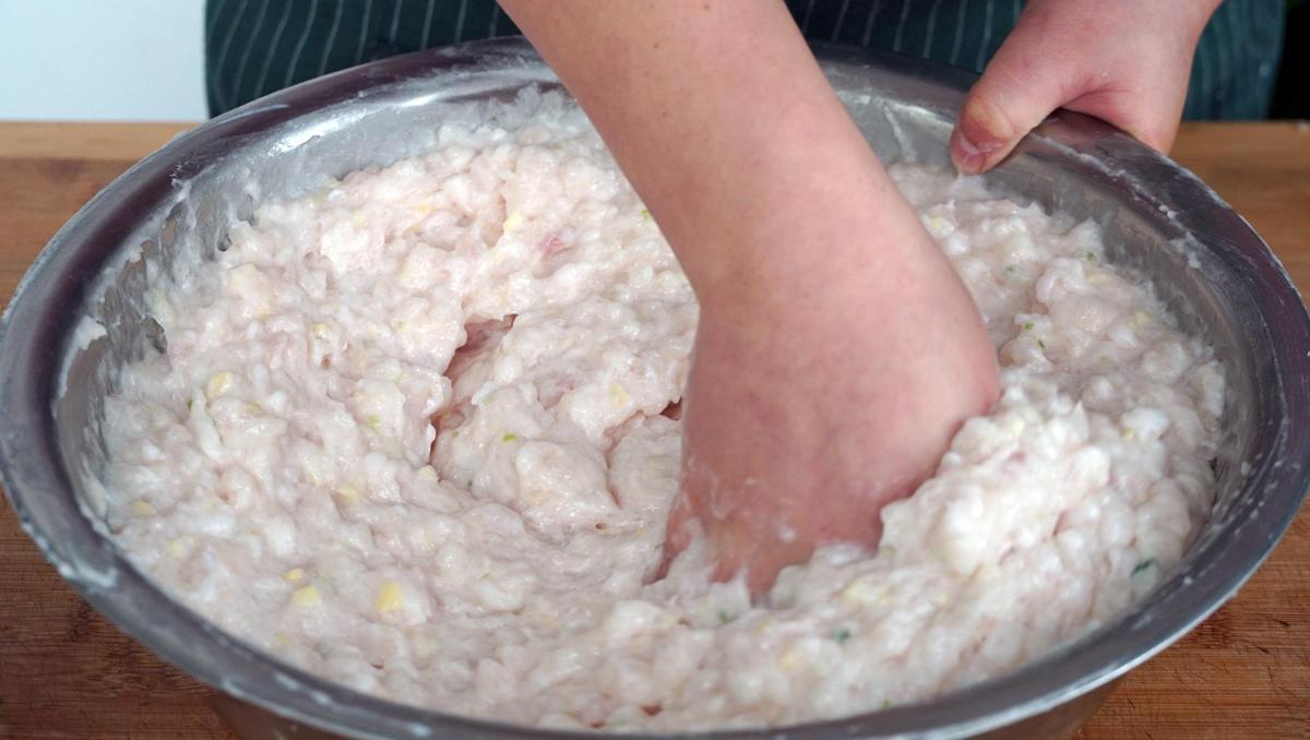 4、都一起倒入肉餡兒裏面來,1勺生粉和少許清水,攪拌均勻後也倒進來。調味兒加鹽、雞精、生抽、胡椒粉,朝着一個方向攪拌均勻,直到肉餡兒拉絲的狀態就可以了。