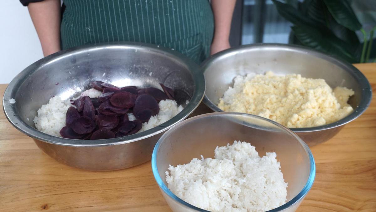 6、糯米蒸熟後也倒出來,分成3份,一份裏面加紫薯,一份裏面加玉米麪,另一份什麼都不用加。