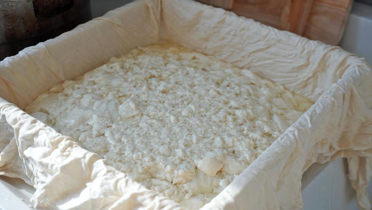 8、剩下的豆腐腦我們就可以用來做豆腐了。先把做豆腐的筐子裏面墊上一層紗布,然後把豆腐腦全部舀進來。