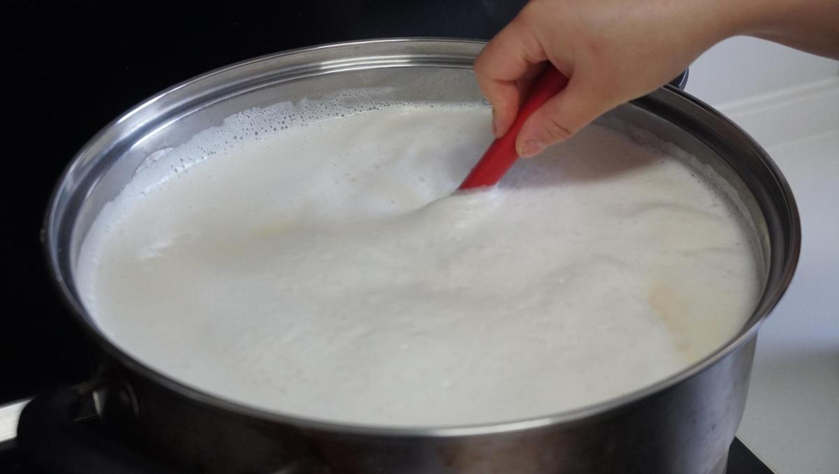 4、豆漿過濾好後就可以開始煮了,邊煮邊攪拌,浮沫記得打去,煮開了不要關火,再繼續煮個5分鐘,然後再關火放10分鐘,讓豆漿稍微的降哈溫,降溫至85℃左右 。