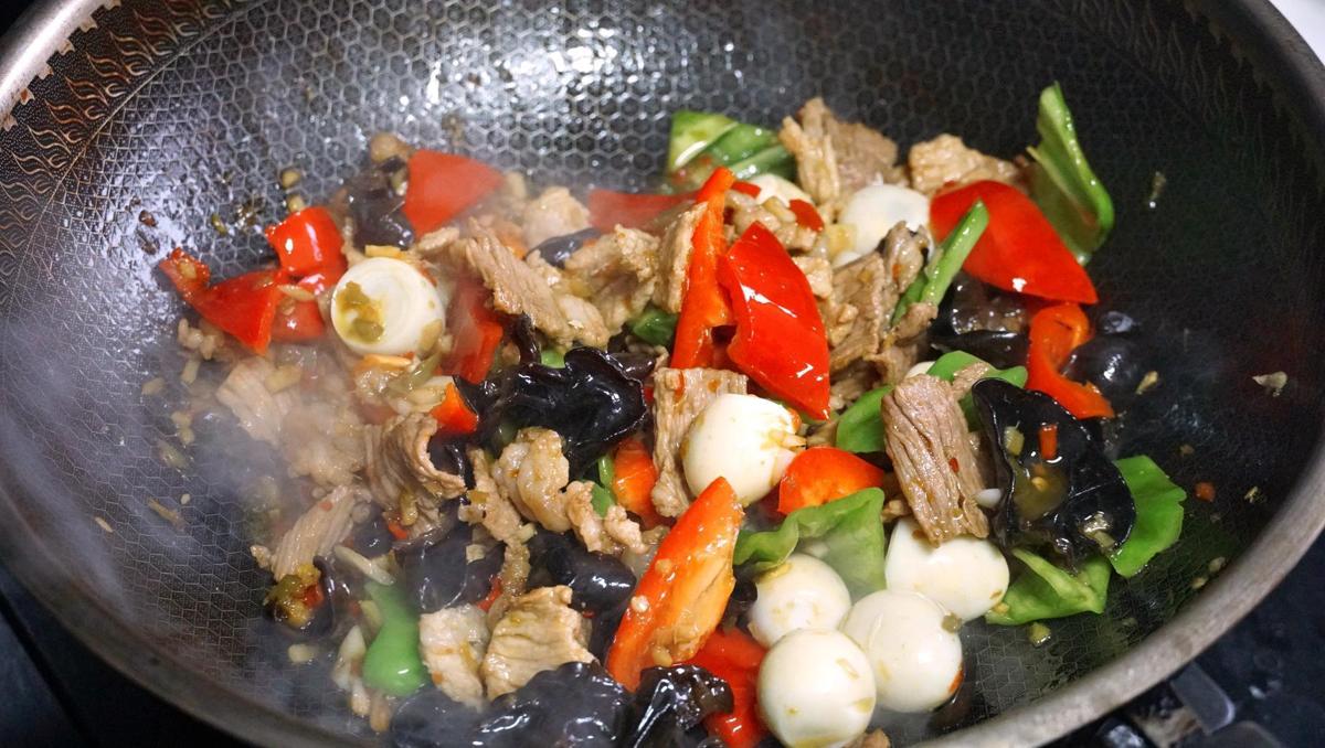 12、“帽子”也就是指炒的菜淋到魚糕上面的意思,我們這邊的一般都是肉片搭配鵪鶉蛋、青紅辣椒、木耳一起炒熟的。