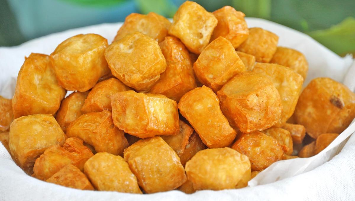 1、這時候我們用它來炸果子,也就是油豆泡,先把豆腐切成小方塊,不要切太大了,不然不容易炸透。