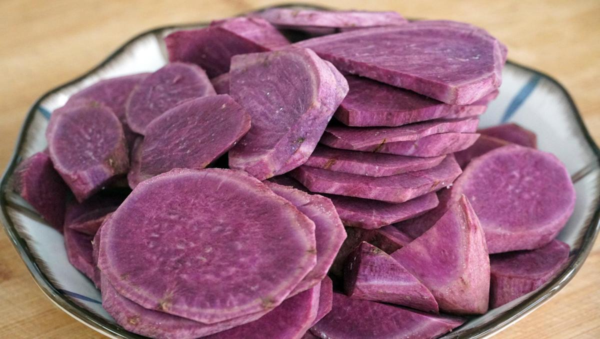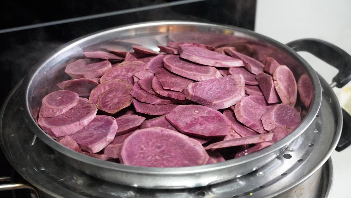 5、再把紫薯也放入蒸鍋裏面蒸15分鐘,用筷子能搓破就可以取出來了。
