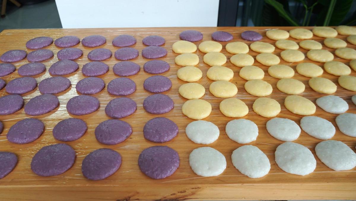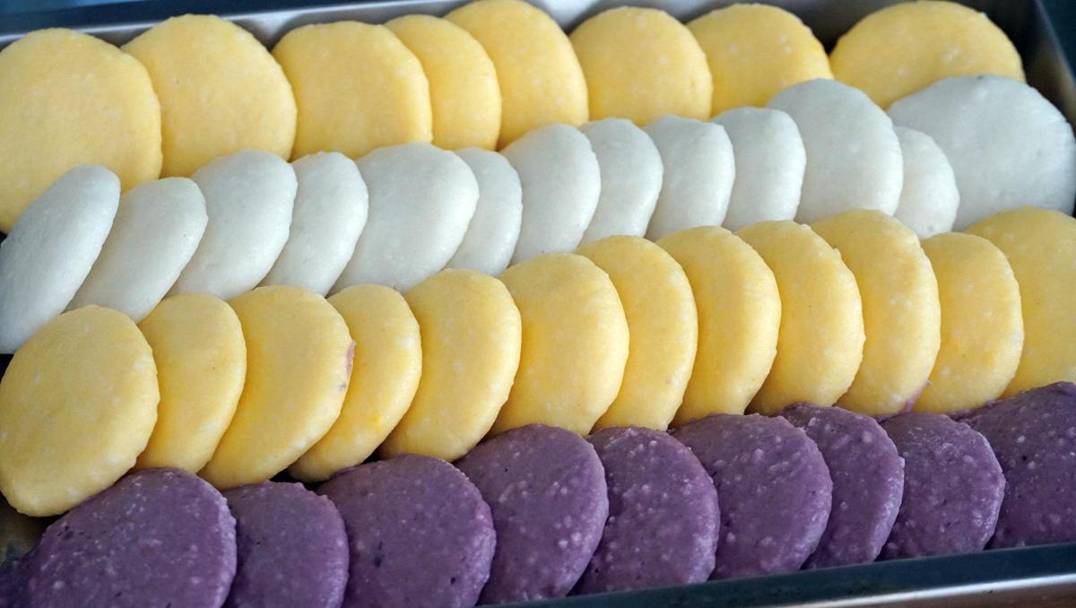 9、分餈粑,取一小團,先搓圓,再壓成小餅,一個小餈粑的模型就出來了,直接喫,又香又軟。如果要存放的話,就要風乾一個晚上。