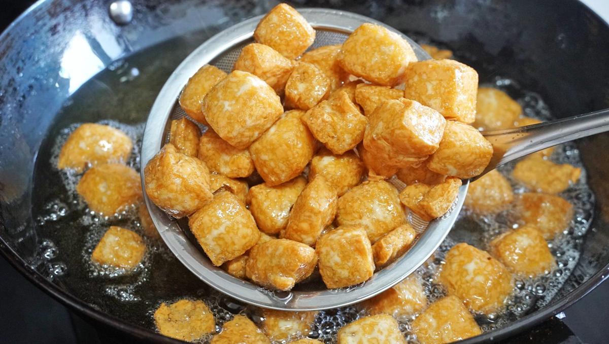 12、全部切好後起鍋熱油,炸這個豆泡要涼油放豆腐下去炸,大概3層油溫就行,用小火去炸。慢慢的,豆腐塊就開始變得圓鼓鼓的了。繼續再炸幾分鐘,顏色也開始變黃了,這時候就可以把小火變成中火,炸到豆泡金黃金黃的就可以出鍋了。