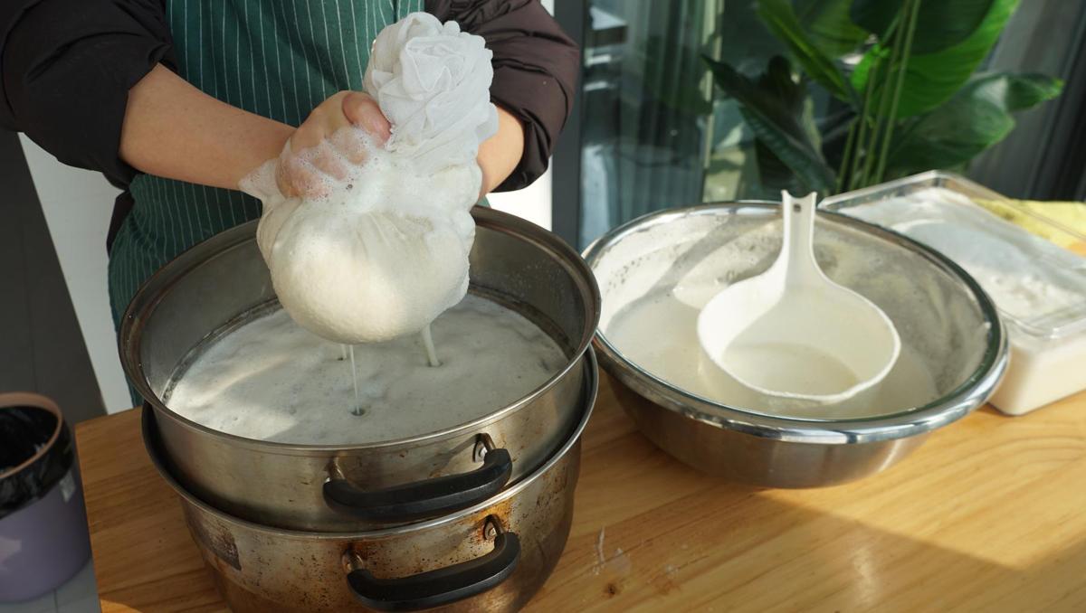 3、現在來過濾豆渣,用力擠幹紗布裏面的水分,濾出豆漿,剩餘的就是豆渣了,這個可以用來做餅,也蠻好喫。