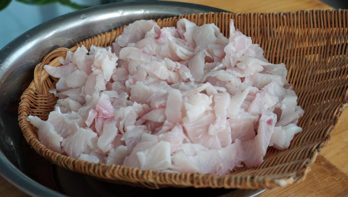 2、片下來的魚肉儘可能的切成薄一點的片片,把魚刺都切斷後到盆子裏,加清水泡2個小時。