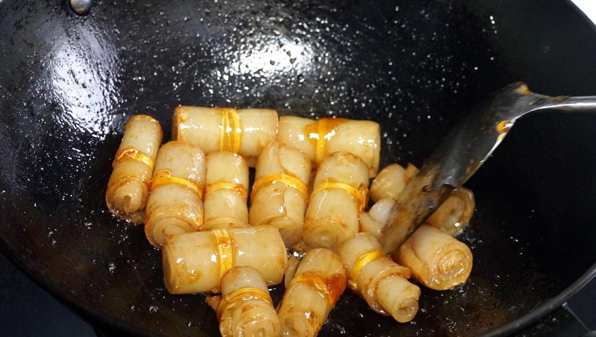 6、接着來滷豬皮,起鍋熱油,加一把冰糖先來炒個糖色。冰糖炒化後再繼續炒一會兒,鍋裏變成棗紅色後倒入豬皮卷,翻炒一下。