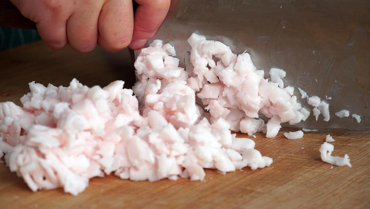 1、先來調餡兒,豬肉1斤,洗淨去皮後剁餡兒。