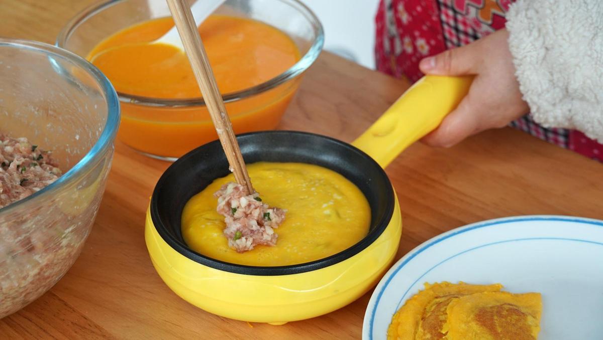 8、轉動一下鍋讓蛋液鋪勻,煎到稍微開始凝固的是就加一筷子肉餡兒進來,肉餡兒儘量放在蛋皮的三地之一處。