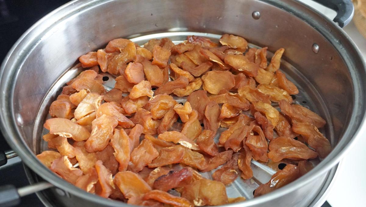 5、第一遍蘋果乾曬好後就收回去繼續蒸第二遍,步驟都是一樣的,倒入蒸籠,大火蒸20分鐘。