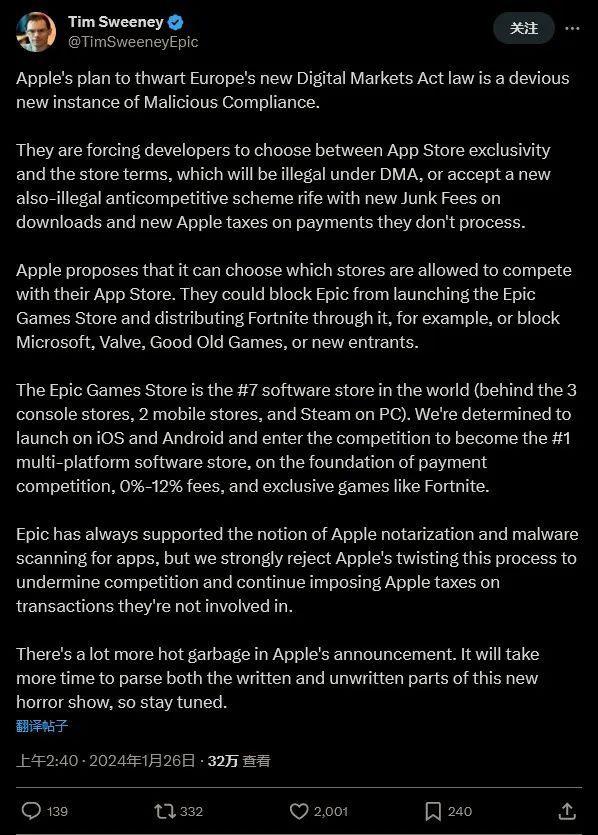 爲此,Epic的首席執行官蒂姆•斯威尼(Tim Sweeney)專門在推特發佈了一篇長文,將蘋果新條款稱爲一坨“熱氣騰騰的垃圾”。