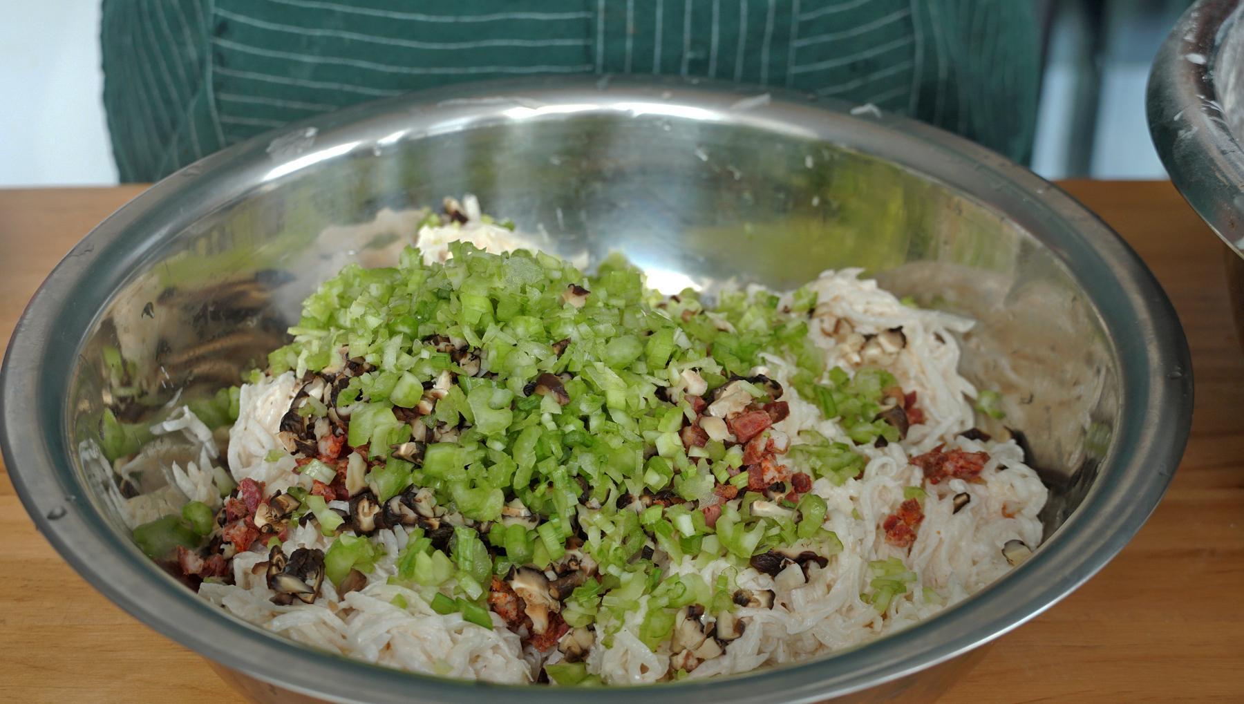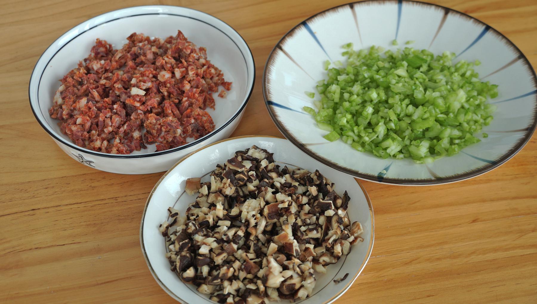 4、接着取一半出來,倒入香腸、香菇、芹菜,翻拌均勻後就可以上鍋蒸了。
