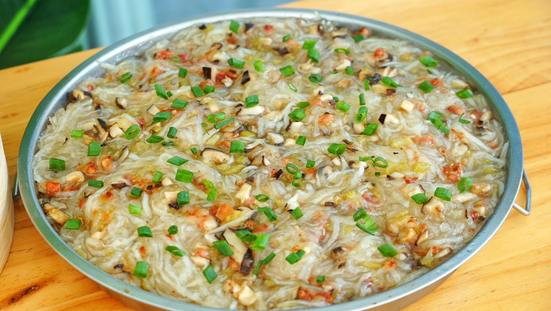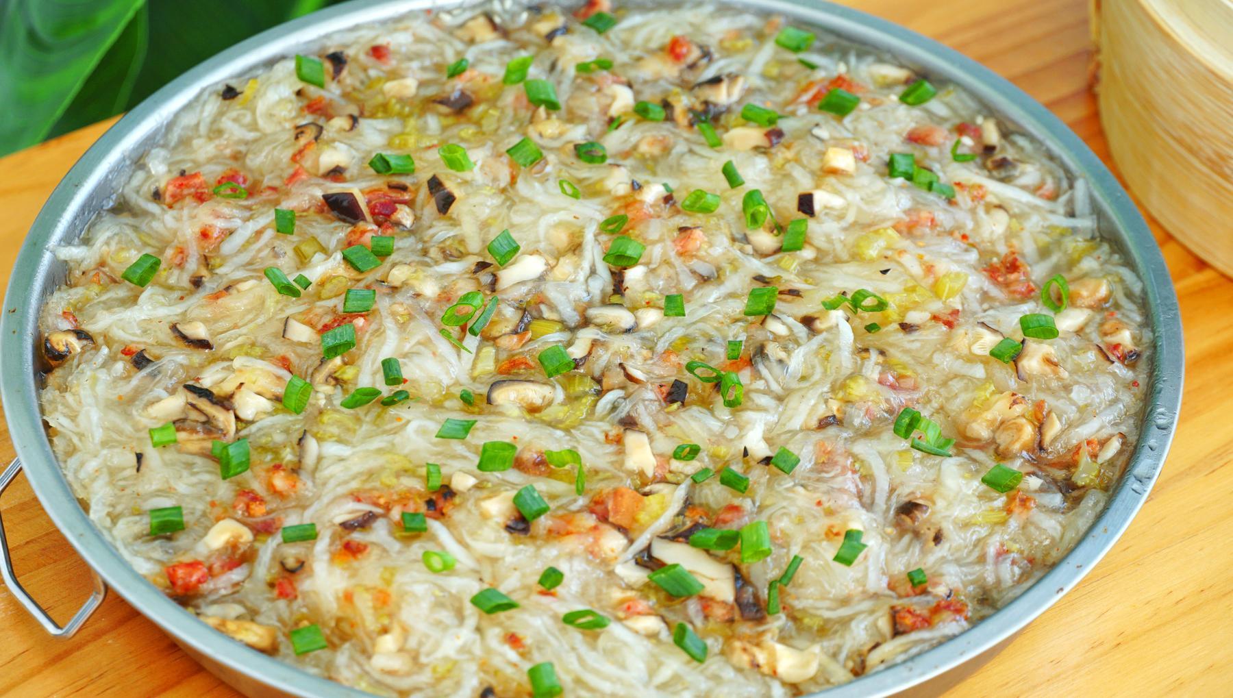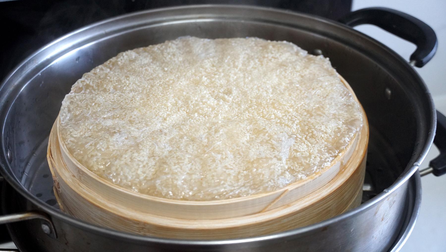 1、接着放入蒸鍋,水開後蒸1個小時,這個蘿蔔糕要全部蒸熟後才能喫哦。