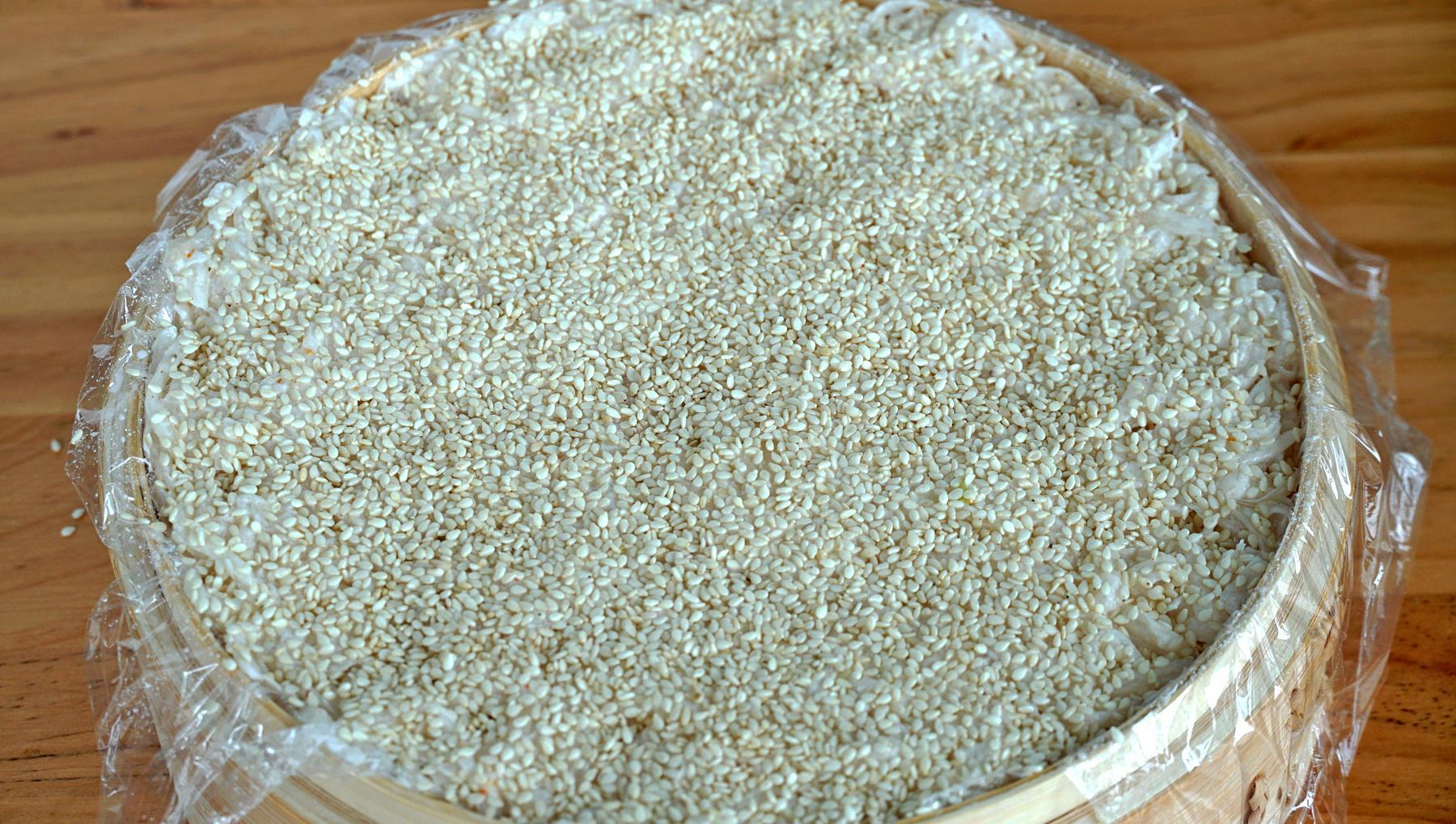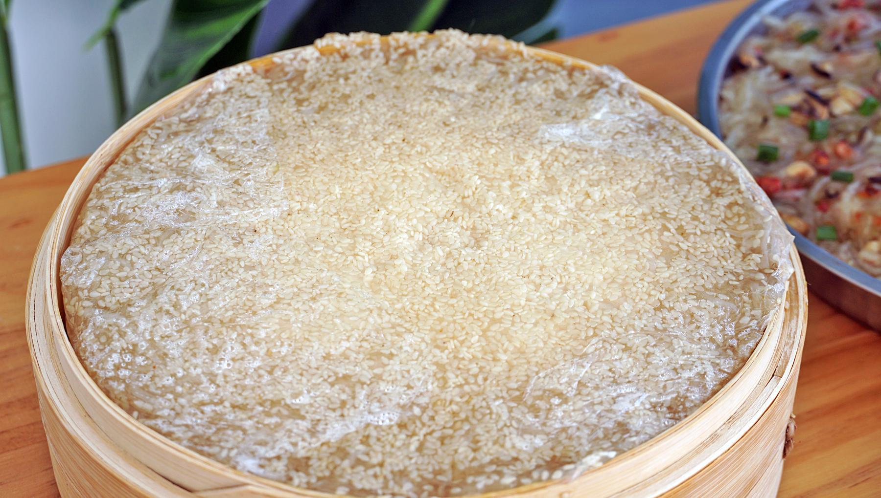 6、另一份就是原味的,底部可以給它撒一層白芝麻,喫起來會更香,蘿蔔絲倒進來拍勻後,最上面也撒上一層白芝麻。