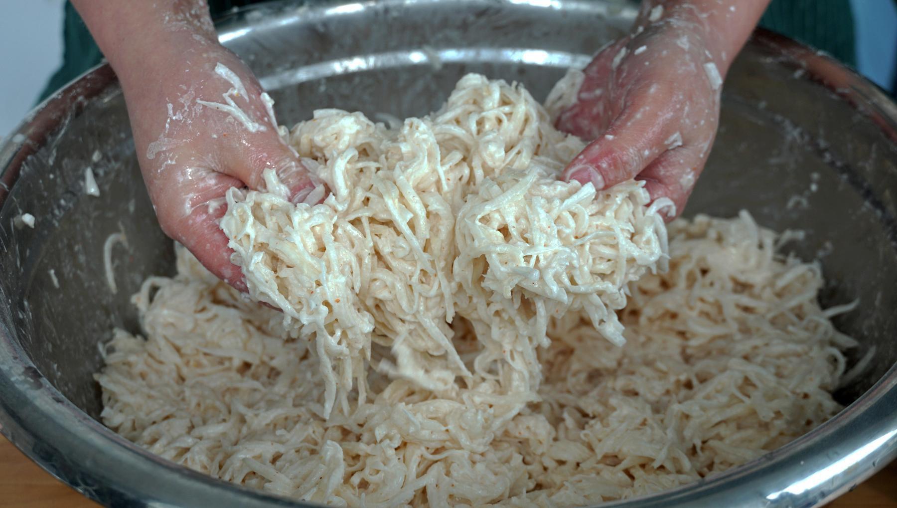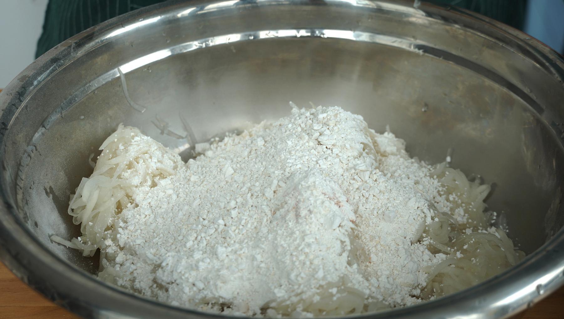 2、紅薯粉的量不是很固定,根據實際情況來加,很蘿蔔絲擠幹水分的程度有關,只要是比較粘稠的程度就可以。