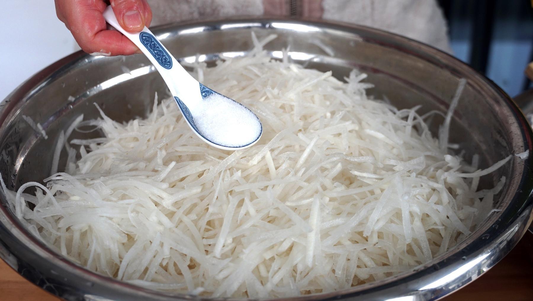 2、接着往蘿蔔絲裏面加一勺鹽,抓拌一下後醃製20分鐘,去一下蘿蔔裏面的辛辣味和水分。