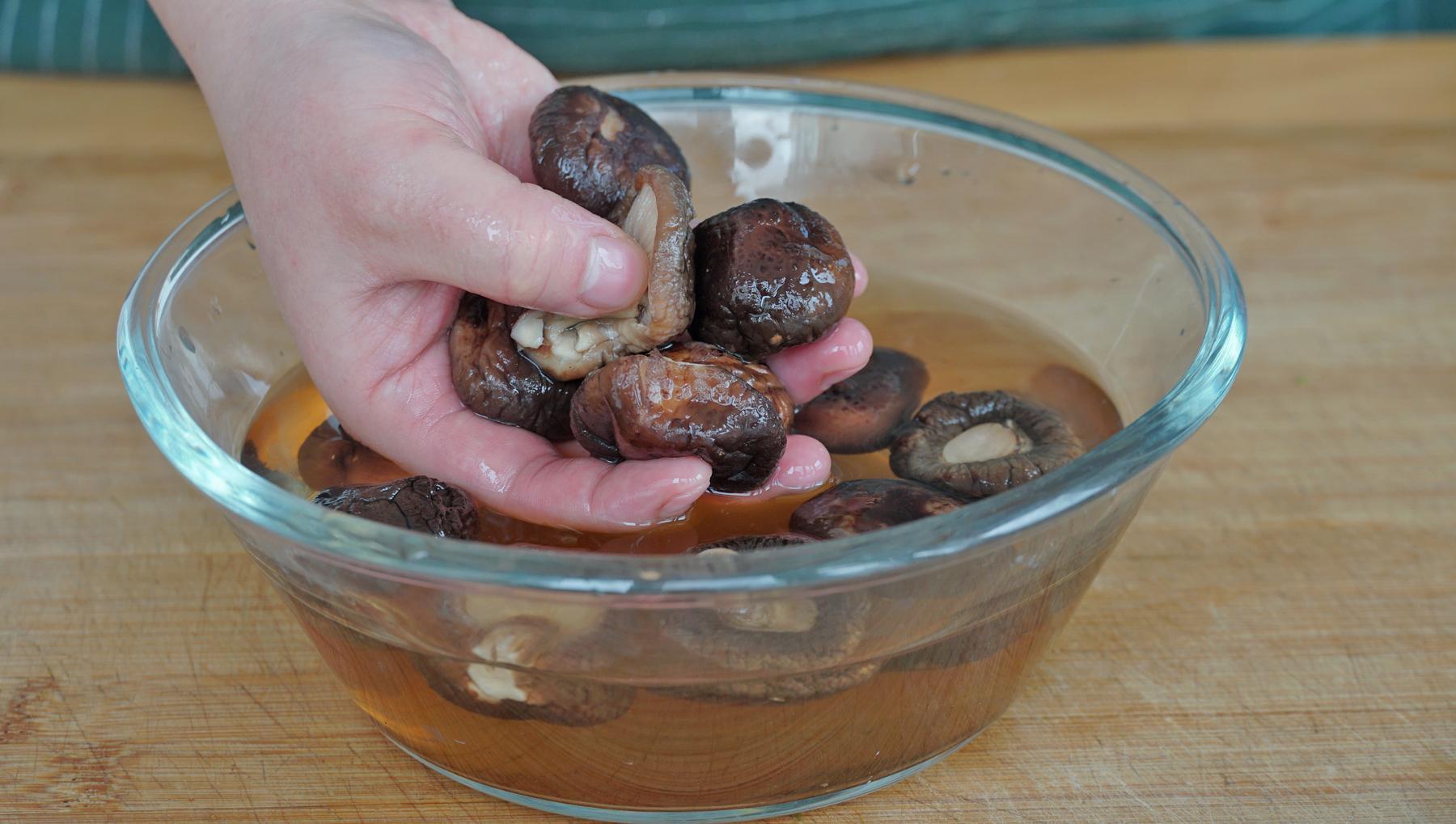 3、醃蘿蔔的時候我們來泡點幹香菇,加熱水泡軟,擠幹水分後切成小丁。