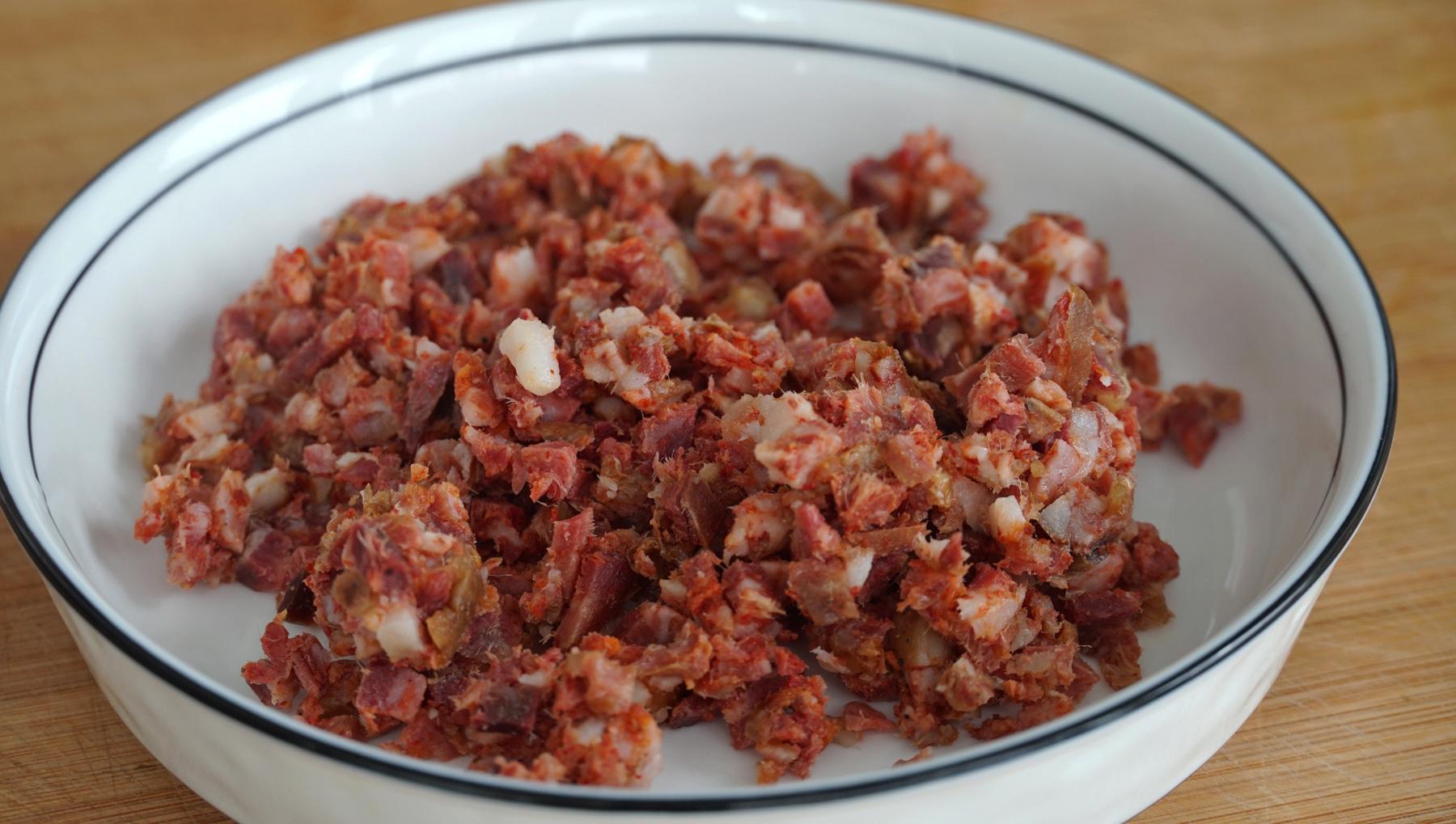 4、再來一節我們自家做的香腸,也切成小丁。