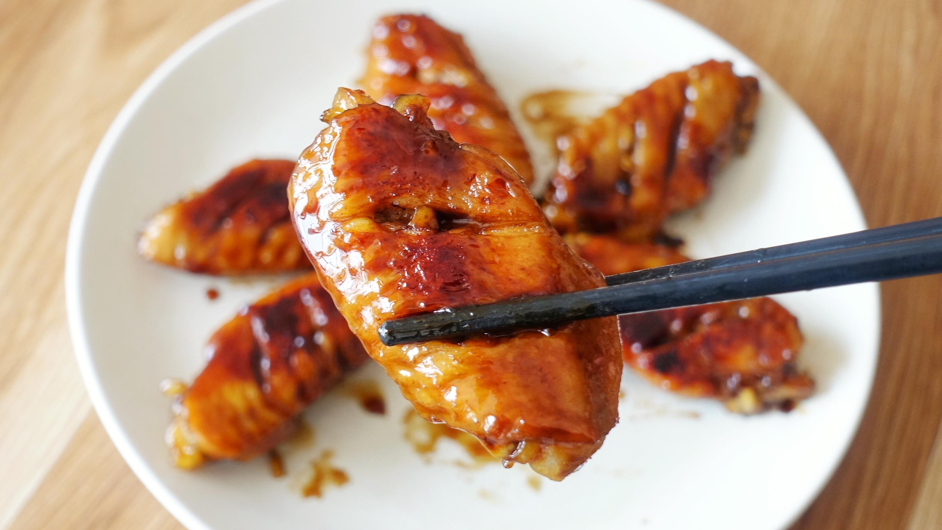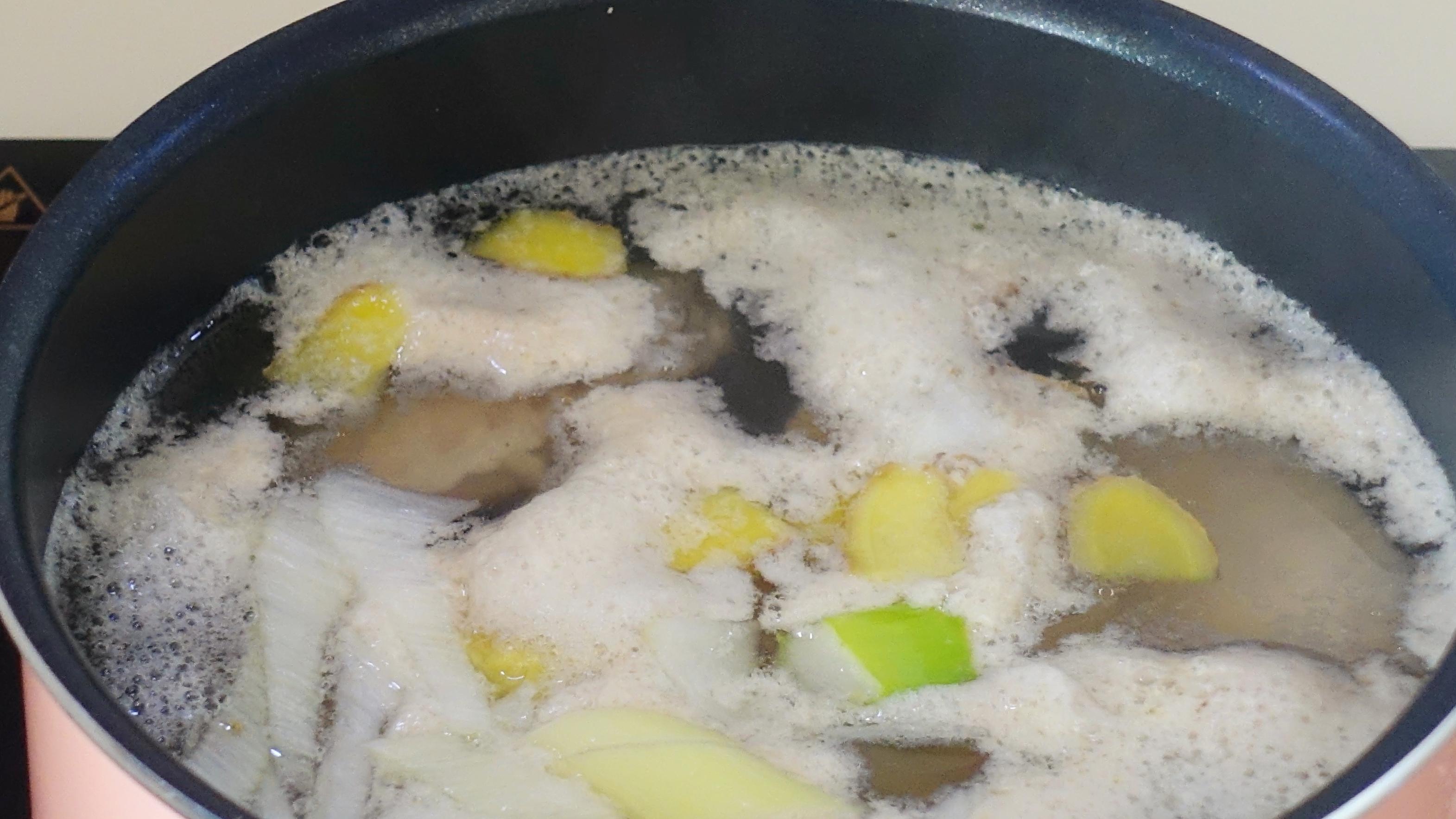 2、撇去浮沫後,將雞翅撈出來洗淨,用廚房紙擦乾表面的水分;