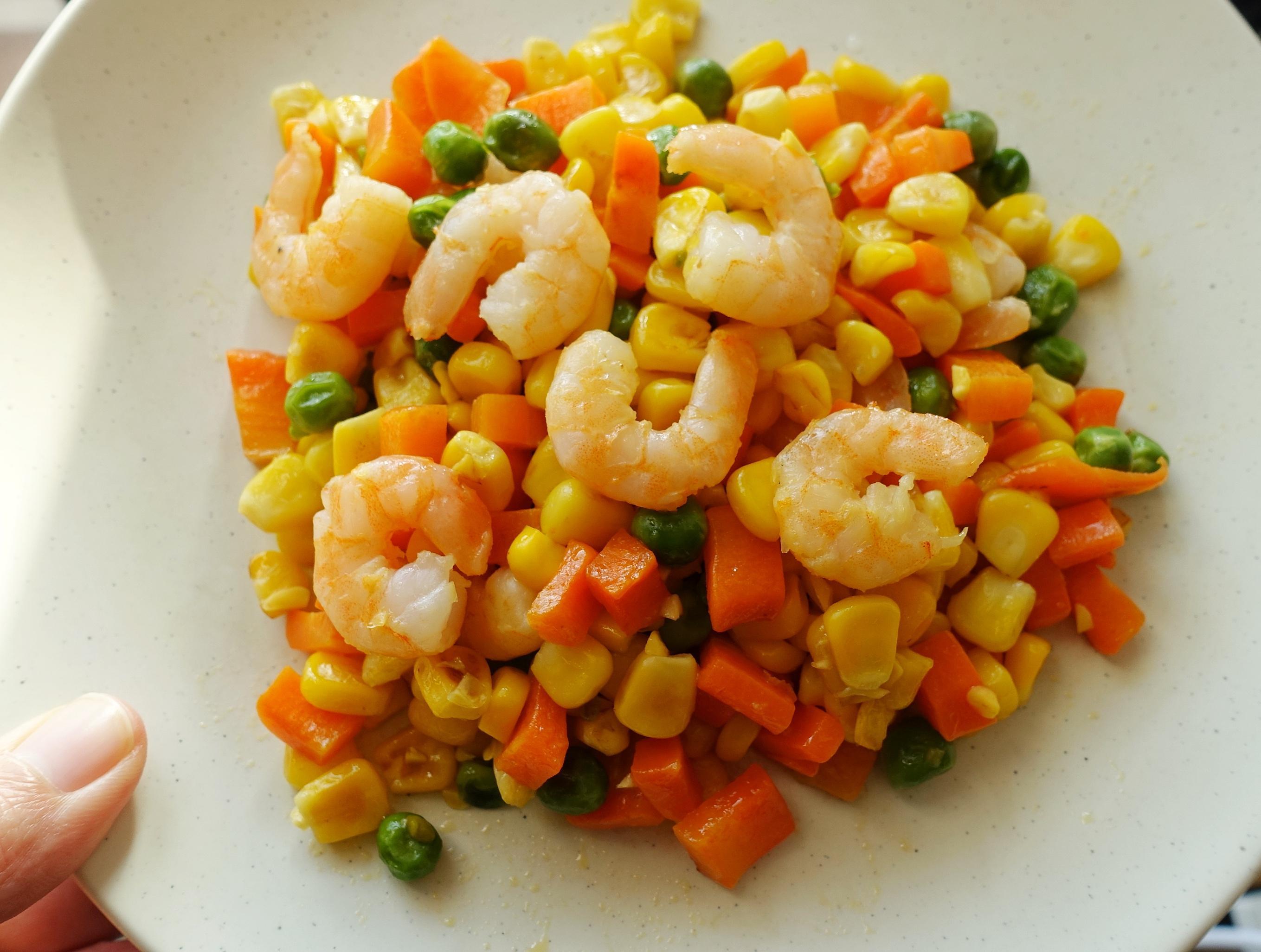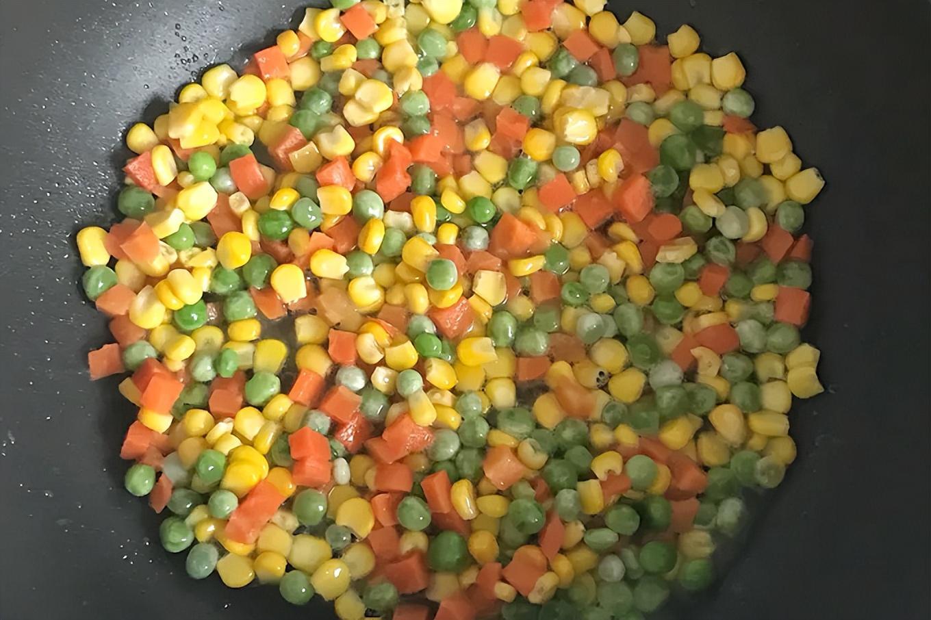 5、鍋內留有底油,倒入配菜(胡蘿蔔、玉米粒、豌豆粒),翻炒2分鐘;