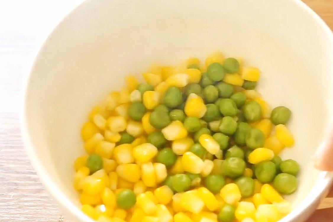 3、鍋中水燒開後,下玉米粒、豌豆粒,煮5分鐘後,撈出來控幹水分;