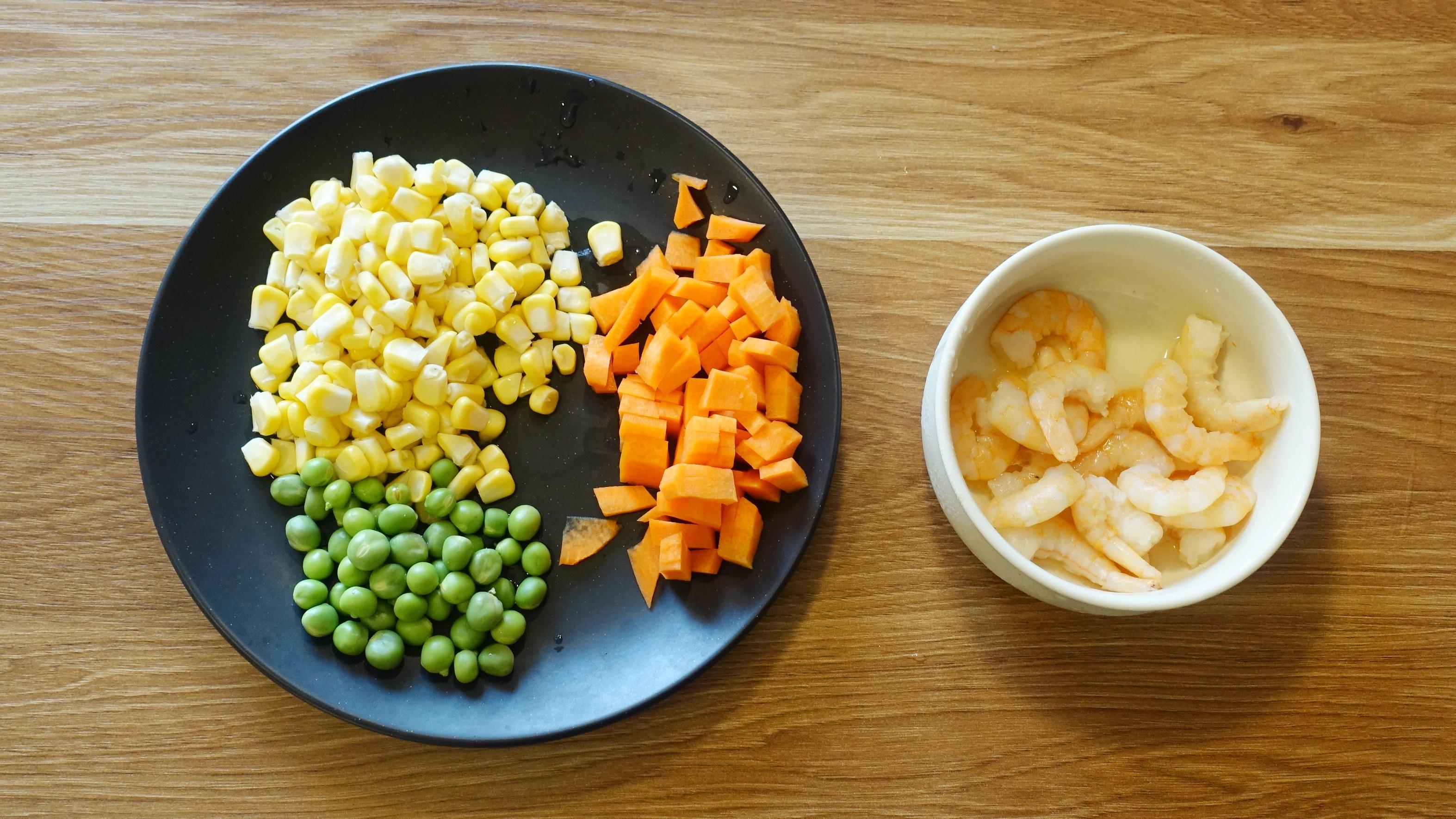 2、胡蘿蔔去皮切丁,再準備一些現成的玉米粒、豌豆粒;