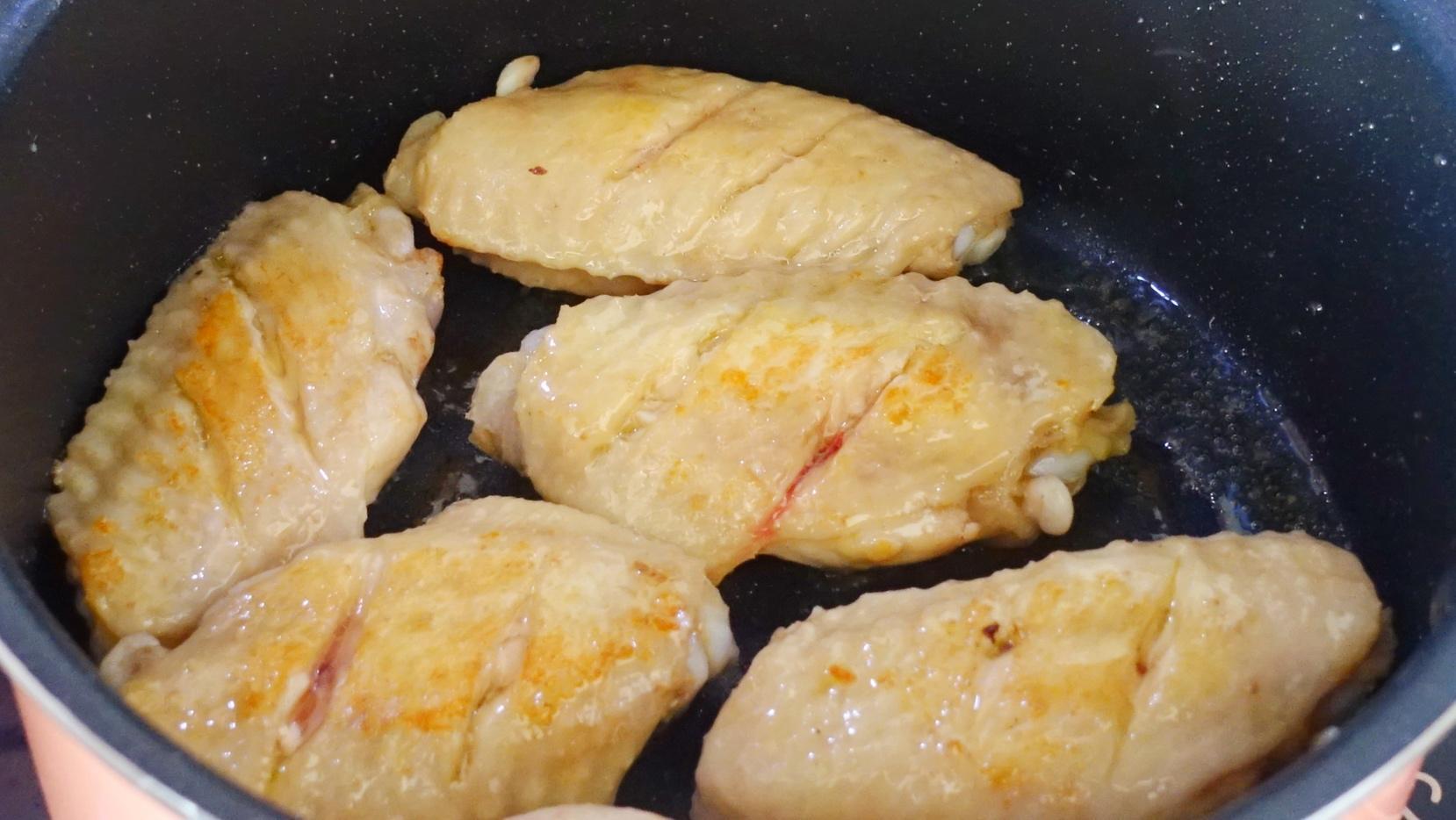 3、在雞翅表面改花刀,然後下入油鍋中,小火煎至兩面變金黃色;